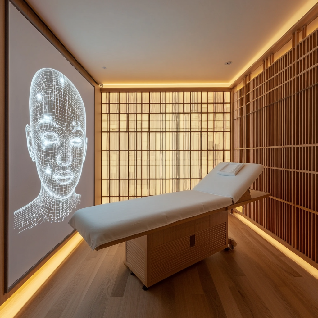 Inside the softly lit treatment room, the air carries the scent of osmanthus rose and vanilla. From the gentle mist of the diffuser, a warm projection casts the intricate meridian lines of the face across the room, softly illuminating the space with intention and stillness.